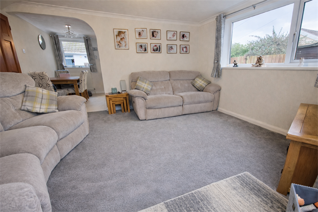 Living Room: Dual aspect living room with upvc double glazed doors leading out to side garden, upvc double glazed window, radiator, coving, ceiling light, TV socket and carpeted flooring. Door to: