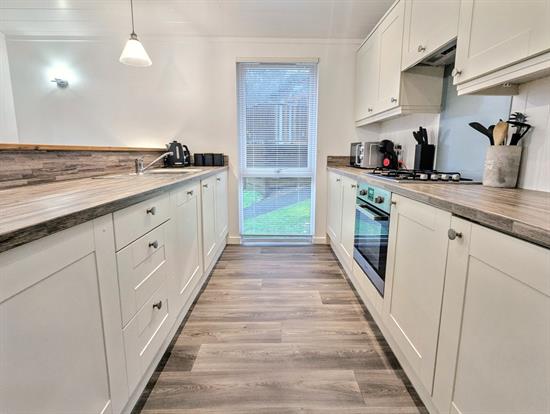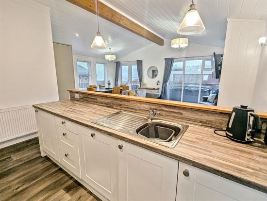The lodge comes with a full fitted modern kitchen with a range of off-white wall and base units, with wood effect roll-top worktops, a single bowl stainless steel sink and mixer tap, an electric cooker, a 4-ring gas hob with an extractor fan over, a dishwasher, an integrated fridge freezer, spotlights, a large uPVC double-glazed window and wood effect wood flooring.