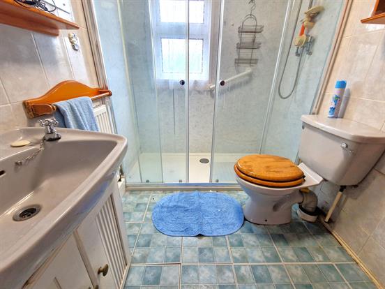 Fitted shower room with walk in double mains powered shower, close coupled WC, vanity basin, single radiator, upvc double glazed obscure glass window and tile effect vinyl flooring.