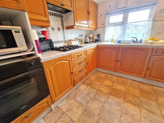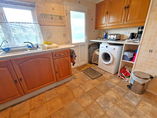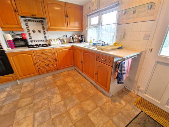 Spacious kitchen with a range of real wood wall and base kitchen units, roll top worktop, composite sink with mixer tap, gas hob, space for free standing washing machine, space for free standing fridge freezer, midi height oven, downlights, extractor, upvc double glazed window, back door to garden, and tile effect flooring.