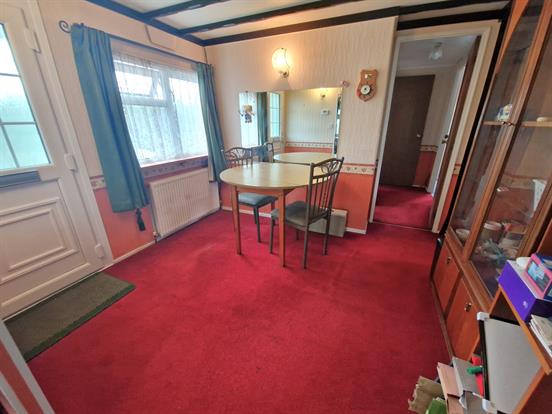 Separate dining room with upvc double glazed window, upvc double glazed door, single radiator and carpeted flooring.