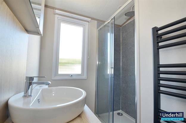 The main bathroom in the caravan features a W/C, a sink with storage beneath, a large shower with 2 shower heads and a heated towel rail. There is an opaque window that allows natural light.