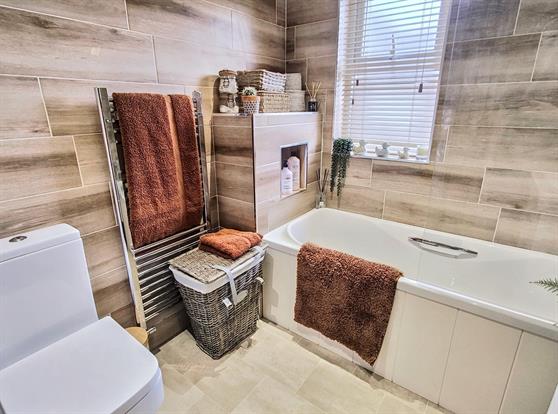 Bathroom: A modern fitted bathroom with panelled bath and shower over, closed coupled WC, vanity basin with mixer tap, vanity mirror, UPVC double glazed obscured window, downlights, extractor fan, walls tiled floor to ceiling and wood effect flooring.