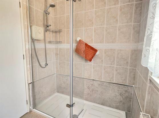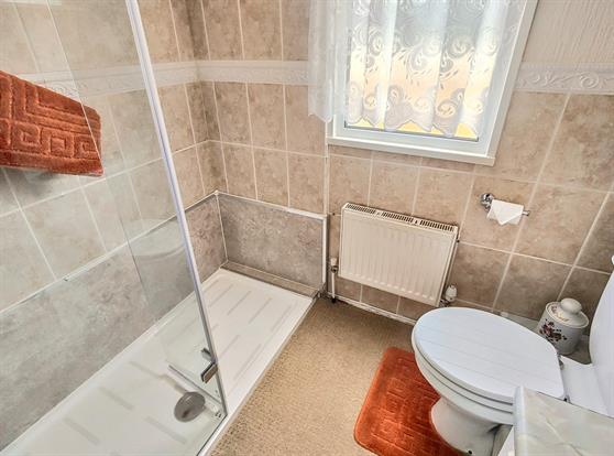 Upvc double glazed obscure glazed window, low profile double electric shower, close coupled WC, vanity basin, single radiator, part tiled walls and carpeted flooring.