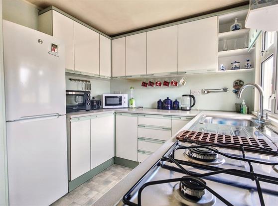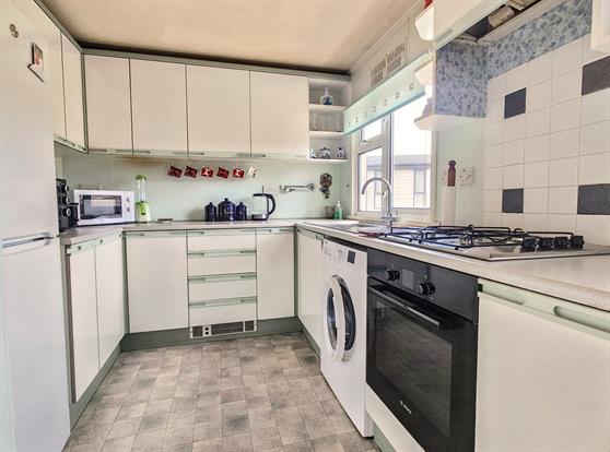 Spotlights, upvc double glazed window, upvc double glazed obscure glass door, wall and base kitchen units, fan oven, space for free standing fridge freezer, roll top worktop, single bowl stainless steel sink with mixer tap, gas hob with extractor over and tile effect vinyl.