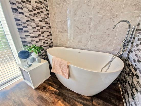 Bathroom: Modern fitted bathroom with free standing bath, close coupled WC, wash hand basin with vanity unit and wood effect flooring.