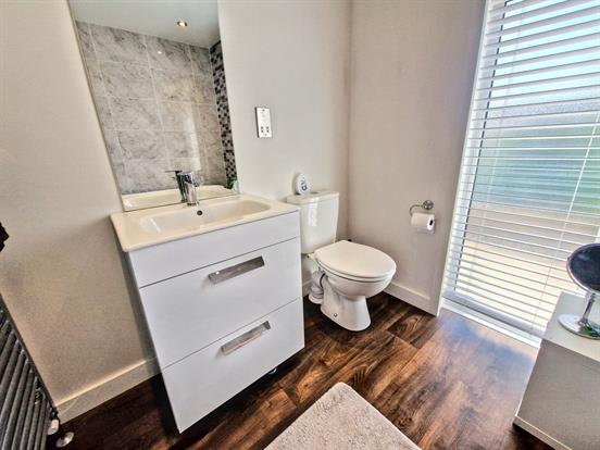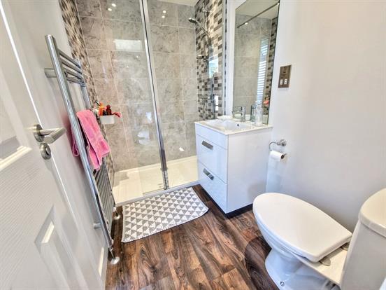 En-suite Shower Room: Modern fitted bathroom with walk in shower enclosure, close coupled WC, wash hand basin with vanity unit, extractor fan, downlights, chrome heated towel rail and wood effect flooring.
