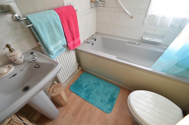 Fitted bathroom with panelled bath with electric shower over, pedestal sink, single radiator, low level WC, UPVC obscured double glazed window to side elevation, walls tiled to splash prone areas, ceiling light point and laminate flooring.