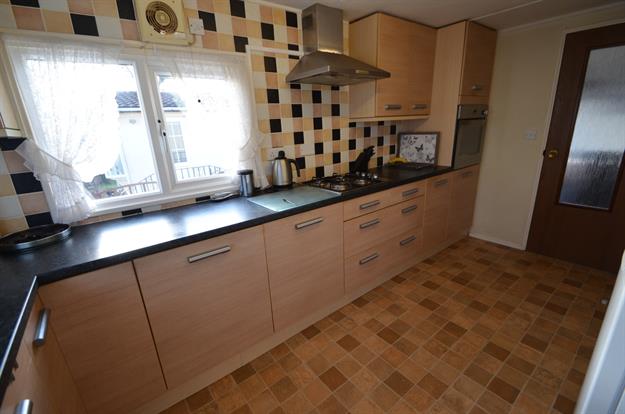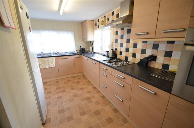 A spacious modern fitted kitchen with wood effect wall, drawer and base units, granite effect worktop, built in gas hob with overhead extractor and mid height oven, one and a half bowl stainless steel sink with mixer tap and drainer, space for free-standing washing machine and fridge freezer, storage cupboard housing Worcester combi boiler UPVC double glazed door to side elevation, UPVC double glazed window to front and side elevations, ceiling light point walls tiled to splash prone areas and tile effect vinyl flooring.