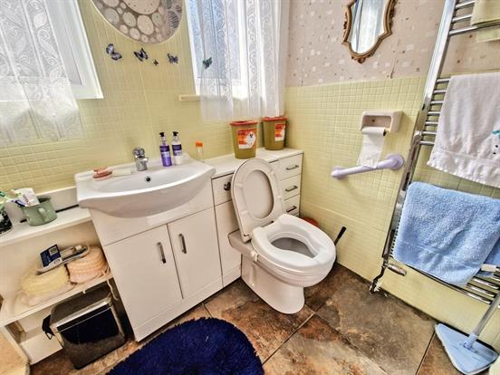 Tiled flooring, W/C and sink with surrounding storage, walk-in shower enclosed by glass and aqua panelling. There is also a heated towel rail and an opaque window that views to the side of the property.